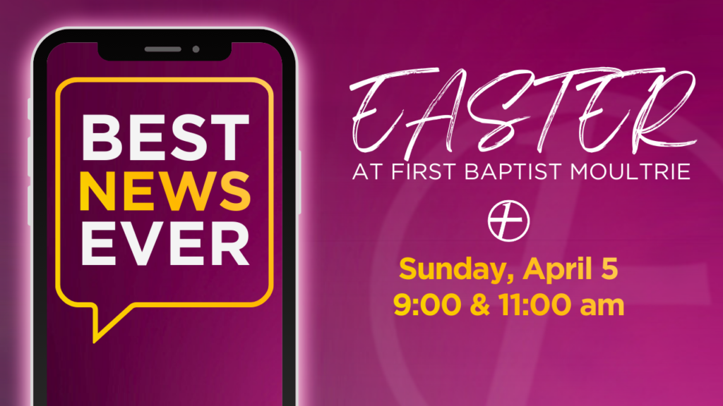 Come hear the BEST NEWS EVER! There will be two opportunities to join us for worship on Easter Sunday! We will have services at 9am and 11am on Sunday, April 5th. We will not have any Connect Groups. There will be nursery and First Kidz worship during both services. We hope you will join us as we celebrate the King who is alive!