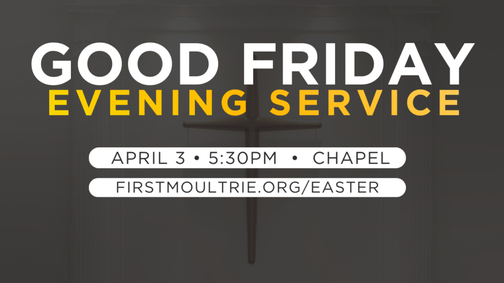 We are inviting the community to join us for a Good Friday Evening Service on Friday, April 3 @ 5:30pm. We will be meeting in the FBC chapel. Join us for this time of worship and a message.