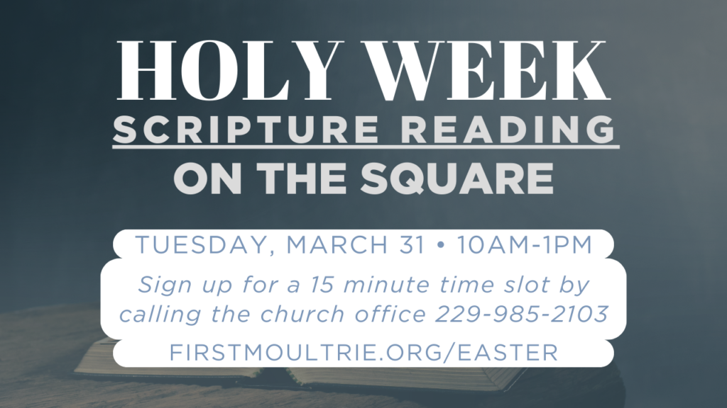 Monday through Friday on the week leading up to Easter there is a tent where scripture is read in Downtown Moultrie. First Baptist Moultrie has sign up for Tuesday, March 31st from 10am-1pm. If you would like to sign up for a spot to read, there is a sign up sheet at the church. You can stop by the office or call us during office hours.