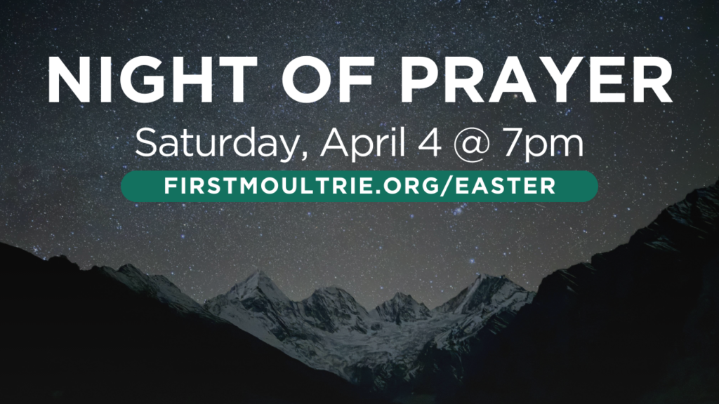 Join together for a night of prayer for the Easter Sunday services at First Baptist Church and across the world. This will be Saturday night at 7pm on April 4th. We will meet and pray in the church sanctuary.