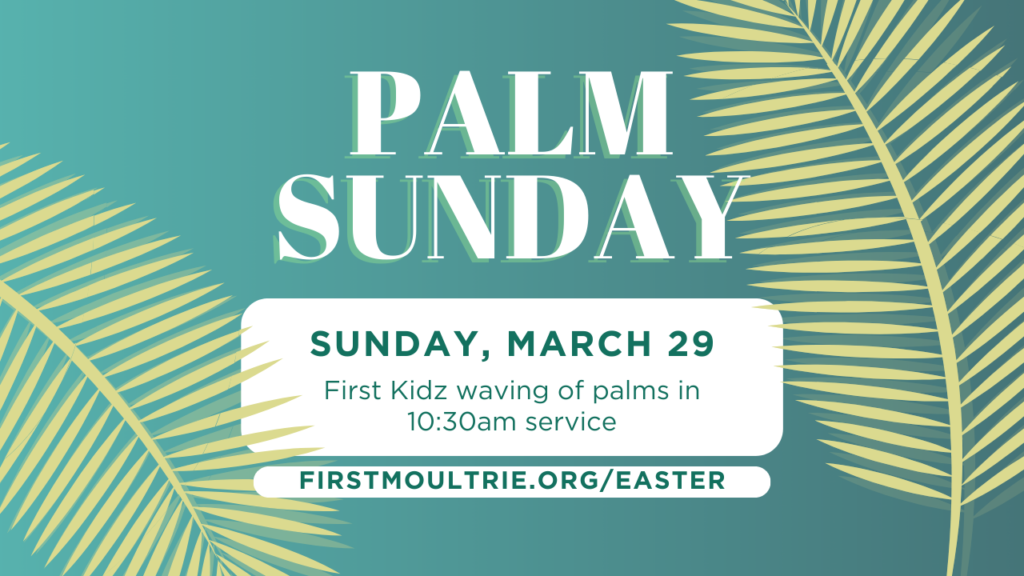 We start the week on March 29th, Palm Sunday. During the 10:30am worship service our First Kidz group will walk around the sanctuary waving palm branches.
