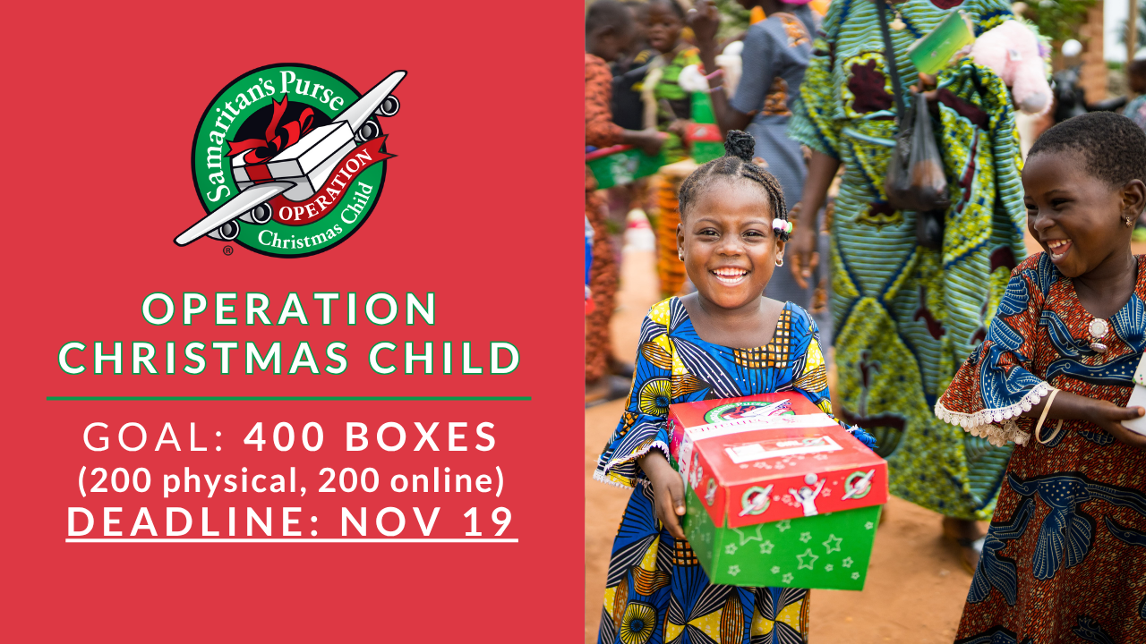 Join us in spreading the gospel of Jesus as we are the hands and feet of Him in giving Christmas gifts with Operation Christmas Child through Samaritan’s Purse. Boxes are available for pick-up in your Connect Group class, at the Welcome Desk, and in the Social Hall. Don’t forget to make your $10 donation and activate the 9-digit code that came with your label.